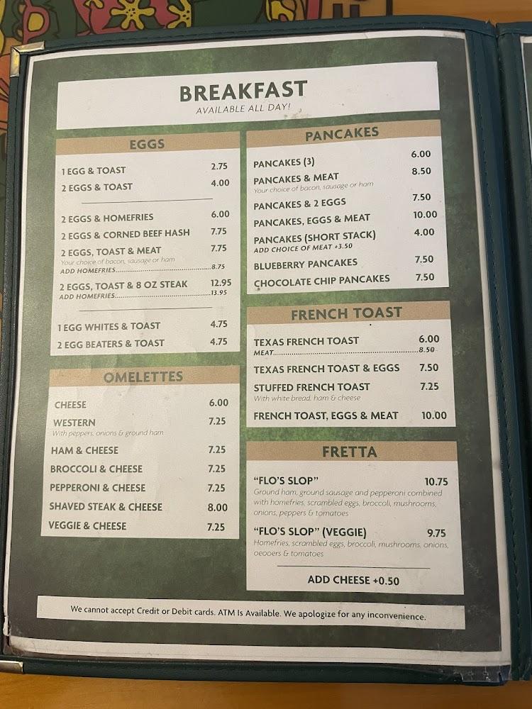 Flo's Diner has an extensive menu featuring classic American fare. Breakfast lovers can indulge in pancakes, omelets, and breakfast sandwiches, while lunch and dinner offer hearty platters and seafood options. The menu is family-friendly, featuring a kid's menu as well. [...]